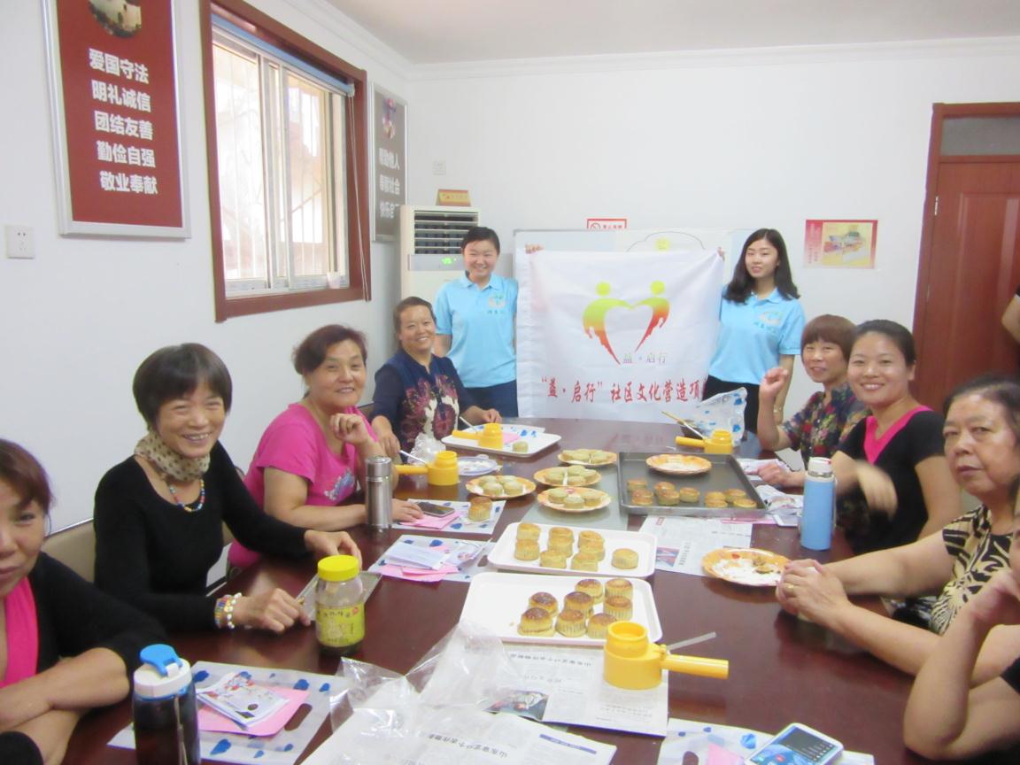 2016年9月9日上午,“益启行”社区文化营造项目社工组织王官庄四区第一社区居民开展了“中秋合家欢”主题活动。本次活动有舞蹈和手工小组的成员、积极党员以及热心居民等14人参加,并且邀请了蛋糕店老师来教居民DIY月饼制作。