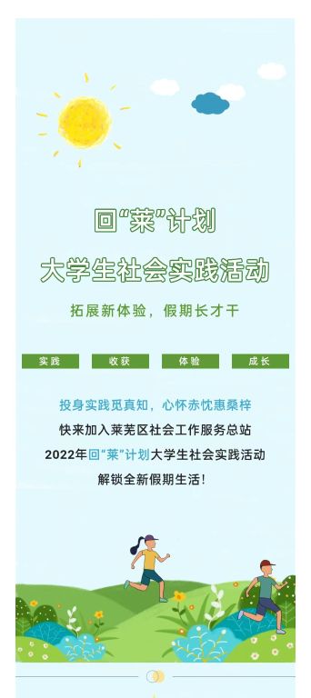 莱芜区社会工作服务总站组织开展2022年回“莱”计划大学生社会实践活动,诚邀莱芜籍社会工作及相关专业大学生加入!