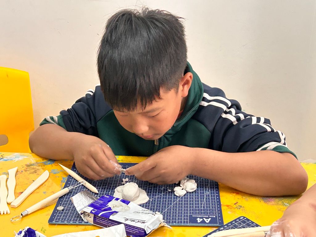 话音刚落,活动进入了淄博特色泥塑文化体验环节。在社工的引导下,孩子们开始尝试将手中的泥团塑形。他们或轻或重地按压、揉捏,泥团在他们手中逐渐变得柔顺,仿佛有了生命。孩子们的想象力如同插上了翅膀,他们有的细致地模仿着淄博的山水,有的则大胆地创造着自己心中的淄博形象。泥塑材料在孩子们的巧手下,逐渐变成了一个个生动的艺术品。每一件作品都充满了童真和创意,展现了孩子们对淄博文化的个性化理解。