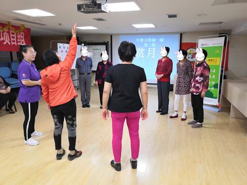 活动以“印象·中秋”、“猜·中秋”、“艺·中秋”、“家·中秋”四个板块相贯穿。在“印象·中秋”环节,社工与叔叔阿姨们一起了解了中秋节的传统习俗,除众所周知的吃月饼、赏月等习俗之外,不少地区还有拜月、放河灯等有趣习俗,叔叔阿姨们也相互分享起自己印象里的中秋故事,一起唱起儿时中秋节的童谣;在“猜·中秋”环节,社工带领大家一起进行了“你演我猜,趣玩中秋”的猜谜游戏,通过“月饼猜猜看”和“习俗演一演”,在欢乐祥和的气氛中加深了大家对中秋习俗的印象;“艺·中秋”环节,能歌善舞的阿姨们纷纷献艺,为大家演唱了《十五的月亮》、《萍聚》等经典曲目,在这一环节,社工特意回顾之前“玩转抖音”活动,用抖音记录下美好一刻;最后在“家·中秋”环节,社工为叔叔阿姨们送上了节日的祝福和礼品,希望叔叔阿姨们身体健康,继续保持积极乐观的生活态度。