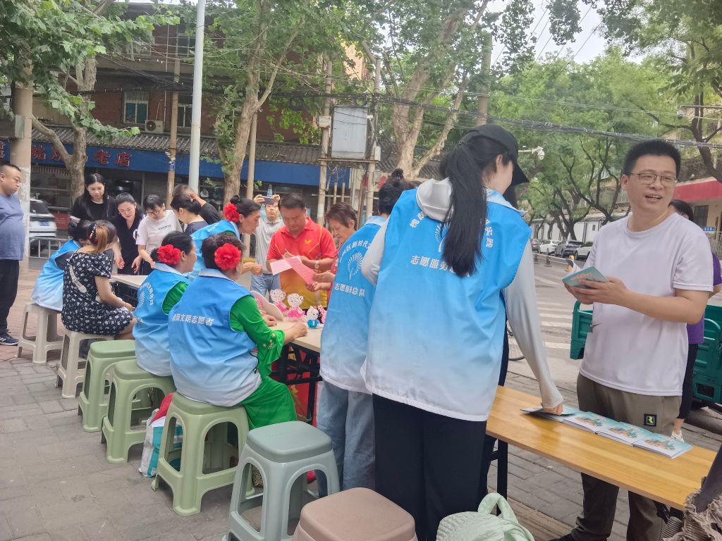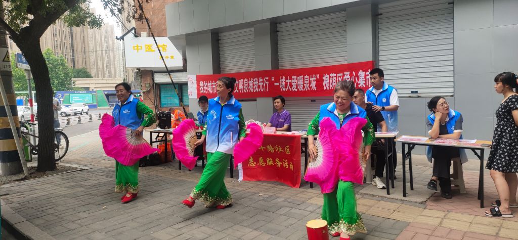 白玉兰文艺志愿服务队星光艺术团的阿姨们不畏炎热在音乐中翩翩起舞,助力公益市集的开展。热闹的场景很快吸引了市民的注意,纷纷前来参加活动。社区工作人员有的发放济南市民文明手册,进行政策宣讲;有的介绍志愿者们制作的爱心义卖手工作品;有的提供义诊服务;有的搜集居民对社区治理工作的意见建议......大家都耐心亲切地与居民交流互动。