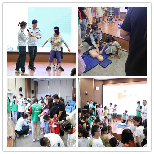 在第一个环节中,急救中心工作人员用生动的图片和通俗易懂的演示向孩子们讲解了手卫生知识—七步洗手法、心肺复苏操作、海姆立克急救法等急救知识;随后,在心肺复苏操作实践中,急救中心的4名带教老师分4组对小朋友进行了心肺复苏实施过程中人工呼吸和胸外按压的要点和步骤操作的耐心指导,孩子热情高涨,学得有模有样;通过培训,孩子们在掌握基本安全防护知识的同时,更加体会到了护佑生命健康的意义。
