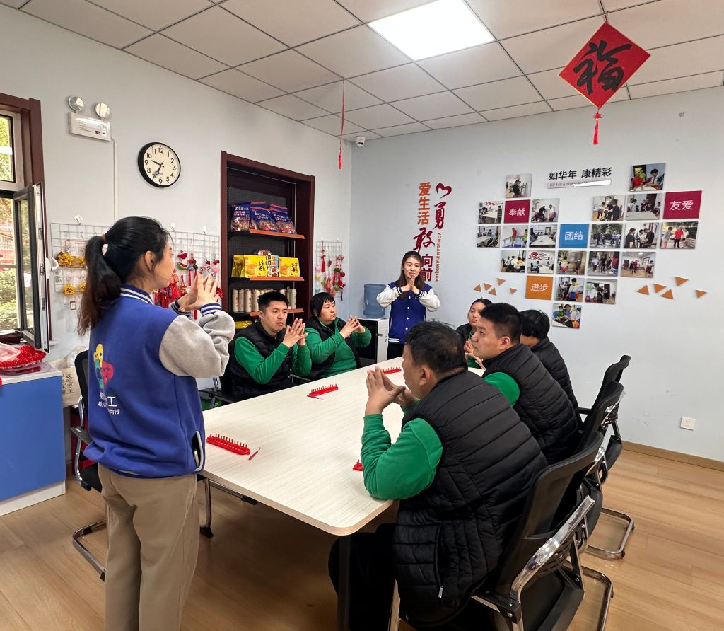 活动开始前,社工带领着学员们做手指操,社工一边示范,一边用温和的语气讲解着每个动作的要领。学员们目光紧随着社工的双手,努力地模仿着。手指操不仅让现场的气氛变得活跃,还可以通过一些简单动作来帮助残疾人学员活动手指、手腕和手臂,增强他们的肢体灵活性,同时也为接下来的活动做好充足的准备。