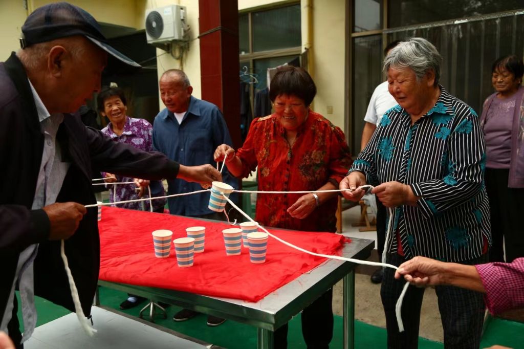 首先进行的是热身游戏——纸杯游戏。四方力量共同拉动纸杯,控制纸杯动向。在团结协作的游戏过程中活跃了活动气氛,还拉近老人们之间的社交距离。让他们在轻松愉快的氛围中感受到了团队配合的魅力。