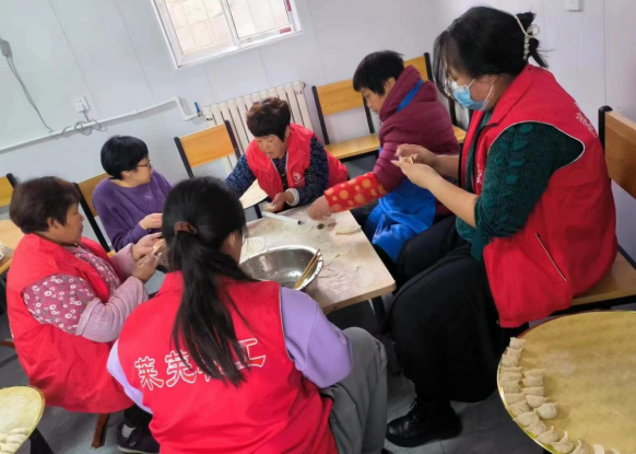 虽然室外寒气袭人,但是在雪官庄村幸福院内,却是一片其乐融融的景象。社工跟工作人员分工合作,不一会儿的工夫,面前的盘子里就摆满了包好的饺子。大家有说有笑,相互切磋包饺子的技巧,彼此比较着饺子的形状,活动现场气氛热烈。