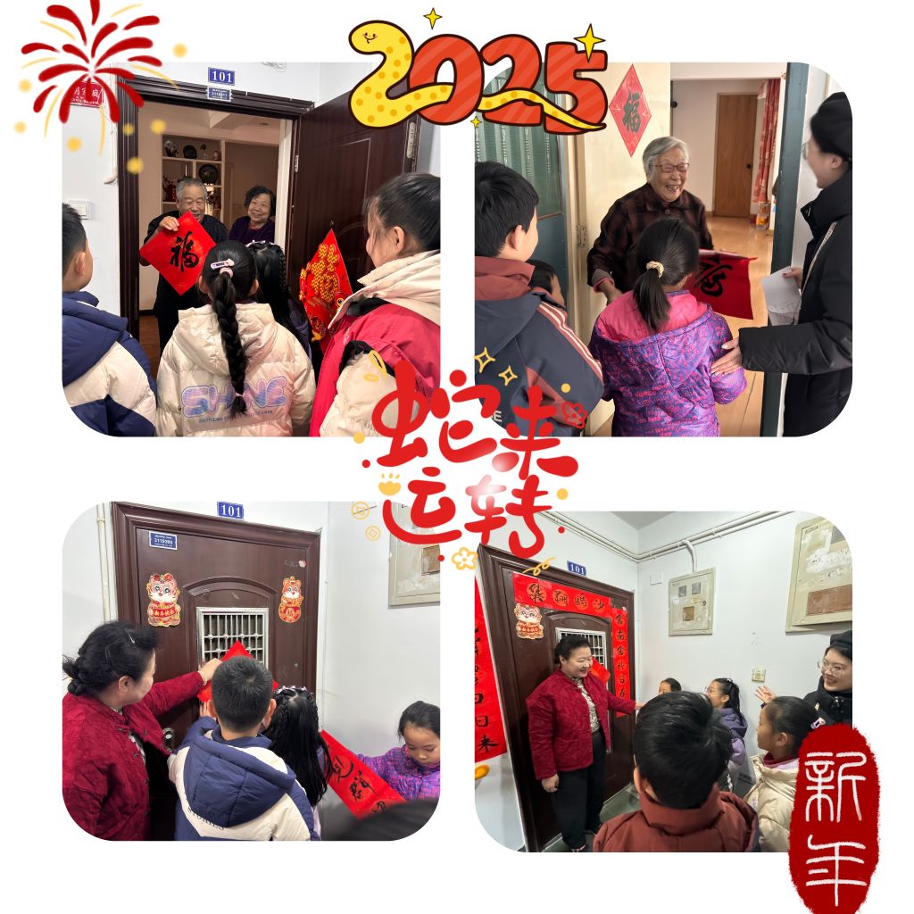 随后,社工详细讲解春联的由来与习俗,并播放《“福”的故事》动画,为小成员们增添了年俗文化的学习兴趣。社工以此为切入点,引导大家学习制作本期活动的年俗作品——“卡通福蛇”。在演示了毛笔的正确使用方法后,社工与志愿者一起带领大家书写绘制蛇年福字,小成员们挥洒创意,用稚嫩却充满力量的笔触,绘制出各具特色的“卡通福蛇”,不仅锻炼了动手能力与想象力,更深刻体会到了福字的深远意义。活动的结尾,社工与小成员们一起带着亲手绘制的福字春联,在小年当天走访社区老人,为他们送去温暖与新春的祝福,亲手为老人贴春联、挂福字,传递着爱与关怀。