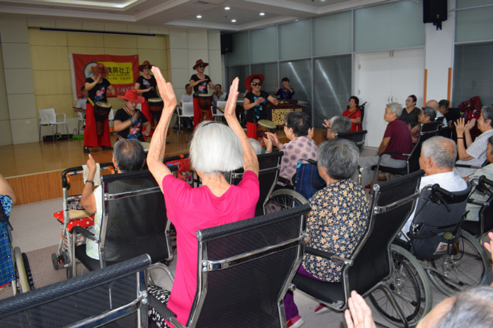 八月的尾巴,初秋,天高云淡,微风开始纷至沓来,没有了七月末的狂热,没有了从内到外的浮躁,这样的天气凉爽宜人。八点,志愿者们就赶到了多功能厅里认真的开始了准备工作,歌声、琴声和笛声响彻满屋,好生热闹。上午九时,演出开始,歌曲《我和我的祖国》、《父亲》、《我们的生活充满阳光》和《草原上升起不落的太阳》歌声嘹亮绕耳,暖人心弦;舞蹈《祝福祖国》和《非洲鼓舞》舞姿优美,动作活泼,深受老人喜欢;笛子演奏《化蝶》和《北风吹》,笛声悠扬,悦耳动听,怡人心脾。最后,演出在合奏《喜洋洋》的欢快节奏中结束。