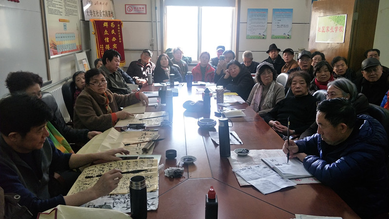 开始上课前,首先由梁南社区主任给大家讲话,祝愿咱们的书画协会新年更上一层楼!然后梁南书画协会会长李永江老师表达了对新会员的欢迎并且宣读了协会会规。一切准备就绪,开始上课啦!活动室虽然不大,但是却挤满了老会员新会员,可见咱们社区对书画学习有兴趣的人太多啦!刘老师从最基础的开始讲起,一横一竖一撇一捺都讲解的非常仔细,大家在下面都聚精会神的听着,全场除了刘老师铿锵有力的讲课声,都在认真的边听边记笔记,连我们都自愧不如啊。现场还有一位92岁高龄的学员也在听课,他就是刘绪厚老先生!社区主任说,从书画协会成立起就坚持来上课了,十年如一日。当之无愧是你们年轻人学习的榜样啊!时间过得飞快,不知不觉就到了下课的时间。大家都听得意犹未尽,下了课都不着急走,有的围着老师询问没听懂的地方,有的问下一次上课的时间,还有的几个人一起讨论今天的学习内容,热闹极了!
