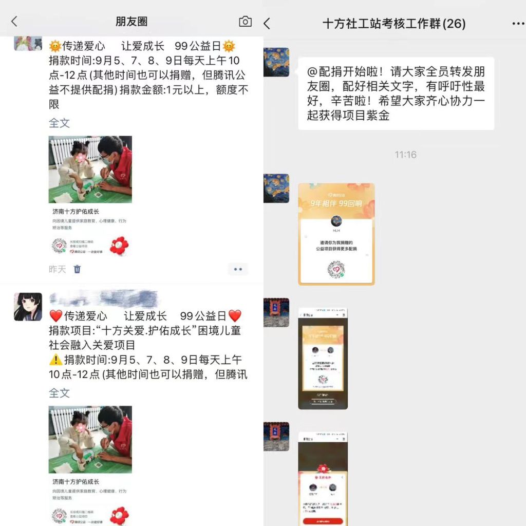线下宣传活动开展的同时,全福街道社工站也积极在微信群、朋友圈、视频号等渠道进行线上宣传和募捐,此次募捐是依托山东省慈善总会发起的99公益日“十方关爱.护佑成长”困境儿童社会融入关爱项目,呼吁捐赠一份爱心,即可为困境儿童获得一次心理疏导和陪伴服务。