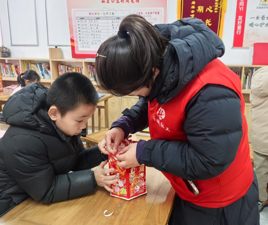 接着,在社工的讲解和指导下,孩子们开始动手制作花灯。不一会儿,一盏盏造型各异、色彩缤纷的花灯便呈现在眼前。孩子们兴奋地举着自己的作品,脸上洋溢着满满的成就感。