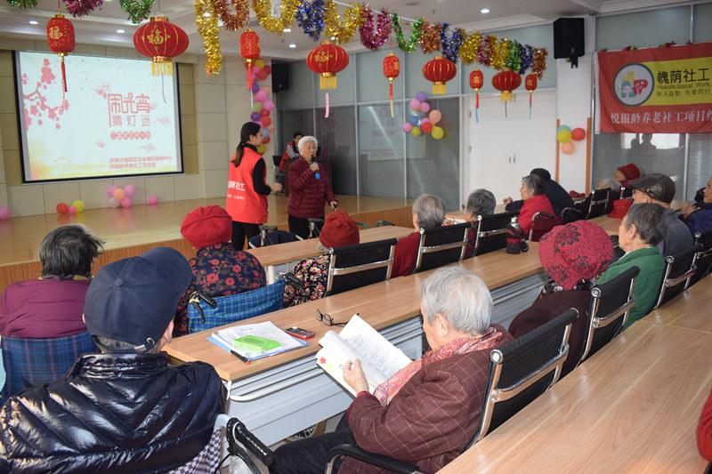 元宵节,又称上元节、小正月、元夕或灯节,为每年农历正月十五日,是中国春节年俗中最后一个重要节令,所以把一年中第一个月圆之夜正月十五称为元宵节,吃元宵和猜灯谜是元宵节的重要传统习俗。值此佳节之际,众诚悦银龄养老社工项目组在槐荫区社会福利服务中心五楼多功能厅举办了“趣闹元宵,喜猜灯谜”元宵节活动。