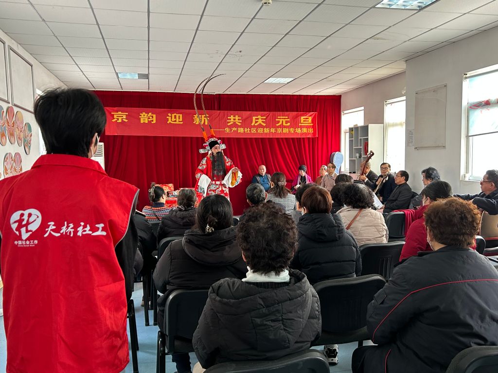 为丰富居民的精神文化生活,增进邻里团结,营造良好的节日喜庆氛围,12月28日,北坦街道社工站联合生产路社区,开展“京韵迎新 共庆元旦”京剧演出活动,活动邀请社区居民共庆佳节,为居民们送去新年祝福。