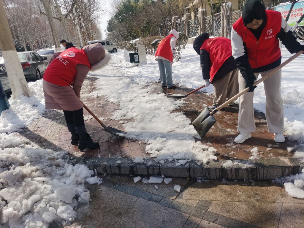 孙村街道社工站迅速响应,组织辖区内志愿者积极投身清雪除冰行动。社工站社工与志愿者们迅速集合,带上铁锹、扫帚等工具,前往辖区主要道路、社区出入口、公交站点等重点区域开展清雪工作。社工与志愿者们不畏严寒,分工协作,铲雪、扫雪、除冰,各个环节衔接有序。尽管寒风凛冽,大家的手和脸被冻得通红,但始终干劲十足,一心只为尽快打通安全通道。