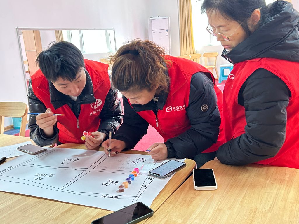 在上一节小组活动结束后,社工与与志愿者小组的骨干成员通过线上联系就本次专业技能培训进行了协商、讨论,根据志愿者们对实地服务需求和培训意愿,最终确定了如何与居民保持良好关系、常见健康监测仪器规范使用、入户探访技能三类学习培训。在活动开始,社工向小组成员介绍了本次小组活动的内容主要是对志愿服务技巧进行培训、探讨共谋志愿服务技能提升之路,小组成员在听完社工讲解的三类学习培训后表示都很“接地气”也表示很感兴趣。社工先以绘制社区资源地形图作为本次小组活动的热身运动,大家集思广益根据所处社区的位置、面积、特色、便民服务、社区景观等要素开始,志愿者们分工明确,但也有不同意见的志愿者争论,社工在聆听争议后,提示志愿者们可以在网上寻找有关的地图文献先绘制出基础社区资源地图、随后再梳理社区资源,给地图上色。在志愿者们沟通合作中虞麓花园小区区域位置、道路等轮廓开始慢慢浮现在纸上。