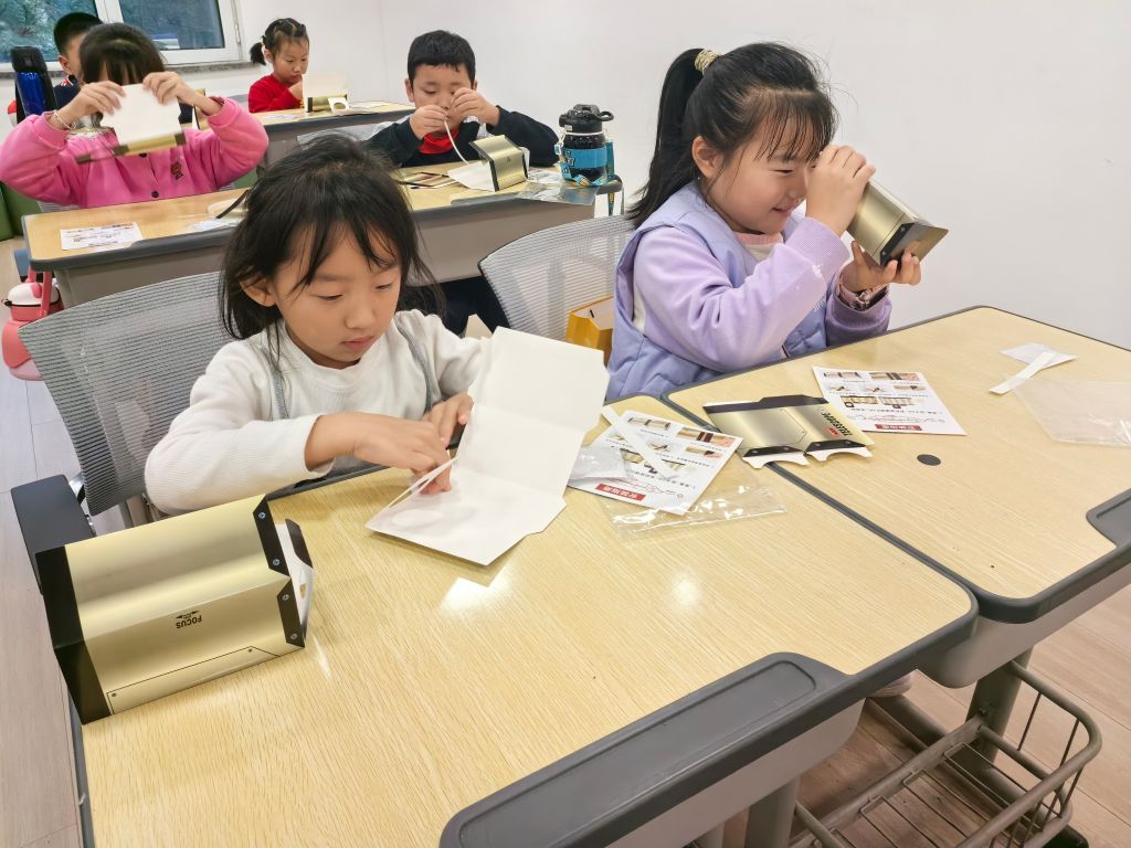 活动伊始,社工通过生动有趣的讲解,向孩子们介绍了望远镜的原理、发展历程以及在天文观测等领域的重要应用。孩子们聚精会神地聆听,不时提出各种充满童趣的问题,展现出对知识的渴望。随后,进入了令人期待的手工 DIY 环节。在社工的耐心指导下,孩子们迫不及待地动手操作起来。他们小心翼翼地组装镜片、调整镜筒,每一个步骤都做得十分认真。遇到困难时,孩子们相互帮助、共同探讨,现场充满了合作与交流的声音。经过一番努力,一个个精美的望远镜在孩子们手中逐渐成型。通过亲手制作望远镜,孩子们不仅对光学原理有了更直观的认识,还锻炼了动手能力和解决问题的能力。
