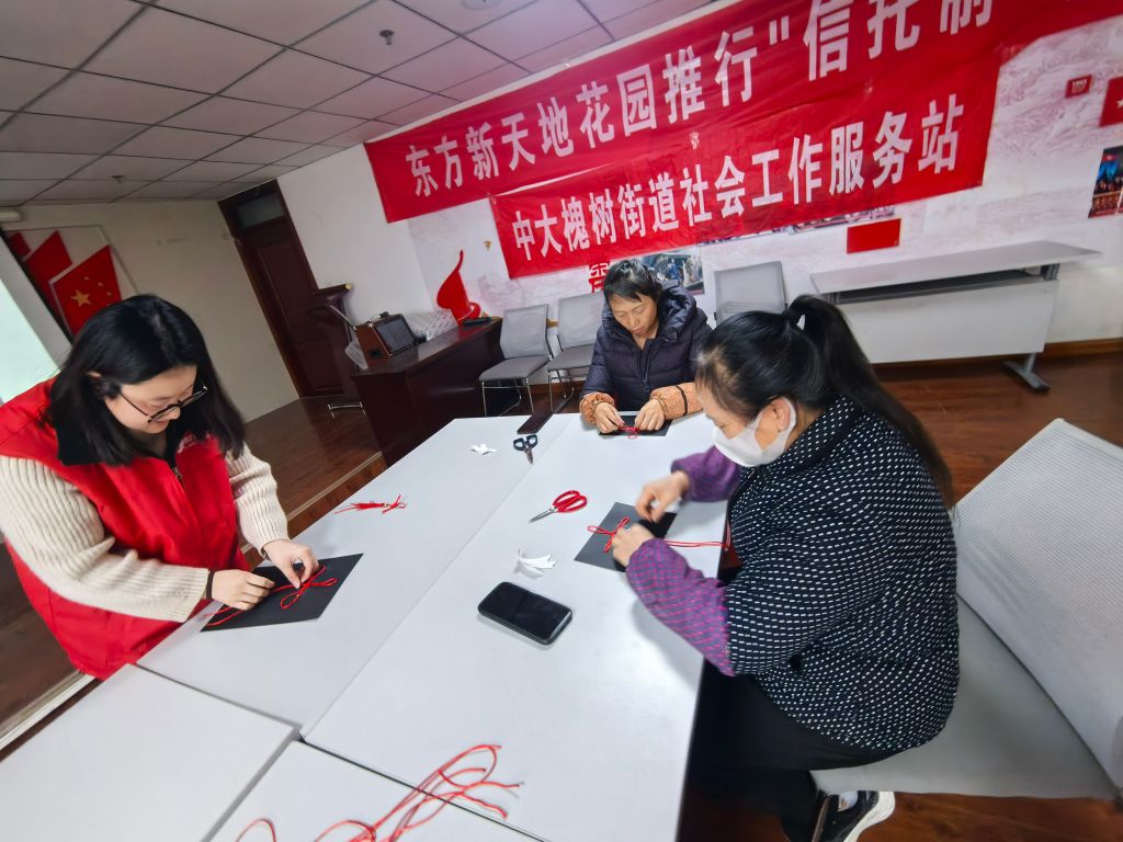 社工带领成员们编制中国结