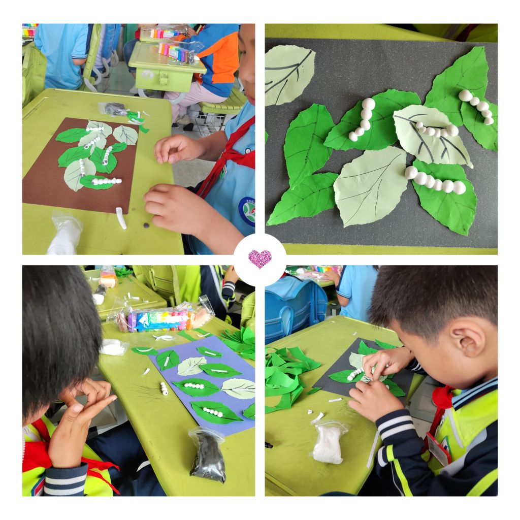 过程中,孩子们沉浸在手工制作的乐趣中,或精心描绘叶脉纹路,或认真搭配蚕宝的大小,社工全程都在鼓励孩子们大胆尝试,勇于创作。对进度缓慢的个别同学会协助其制作并给予言语鼓励,现场气氛高涨,不时传来阵阵笑语。