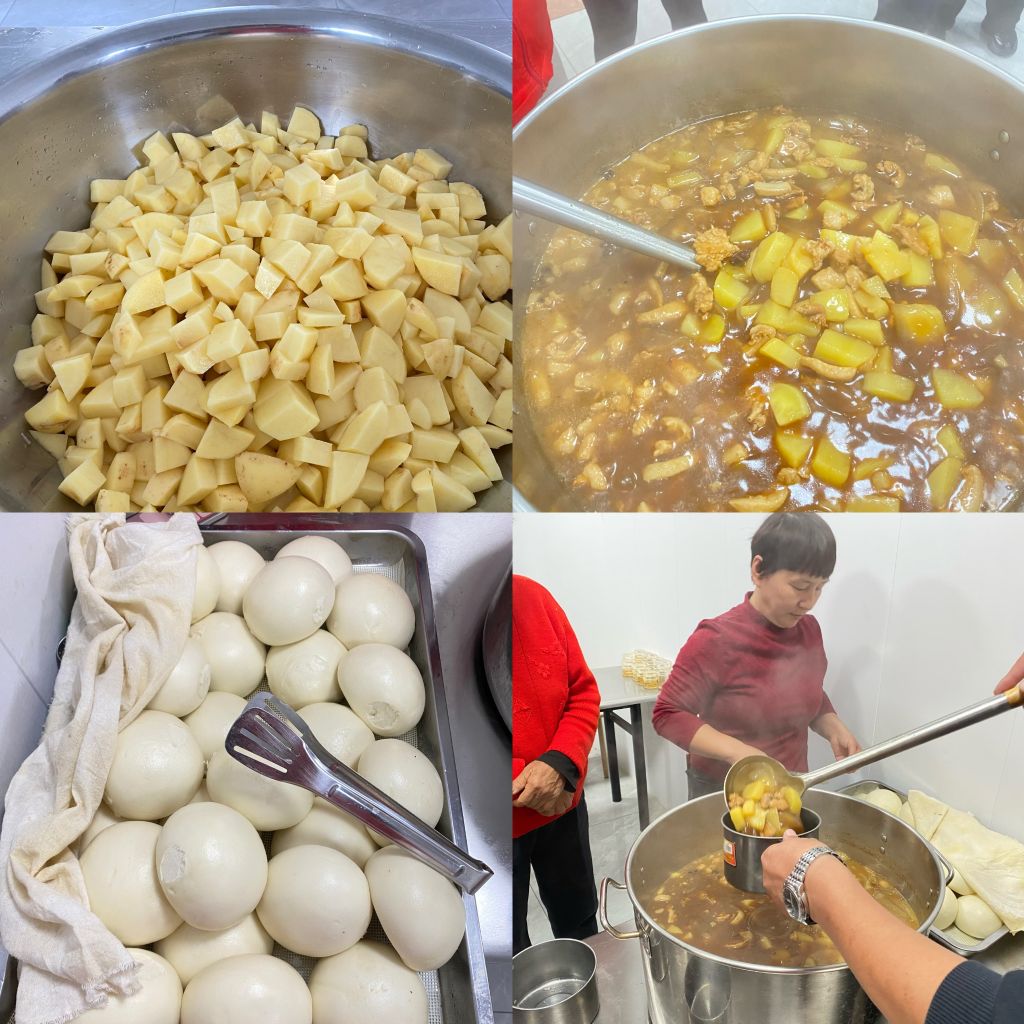 一大早,志愿者带着食材前往幸福院,大家一起搬下食材为老人做起了饭。社工积极参与,与志愿者分工合作,默契配合,有的洗菜、有的切菜、有的切肉,每一项助餐准备工作都干得井井有条。过程中,社工和志愿者互相分享平时煮饭以及参与志愿服务的经验,加深了解。上午11点,朱各务村幸福院已经是饭香扑鼻,老人们翘首以盼,等待今天的饭菜出锅。在社工的引导下老人们有序入座,丰盛的菜肴陆续上桌,老人们津津有味的吃了起来。