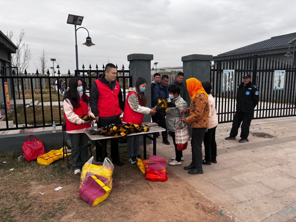 活动中,社工手持鲜花,发放给前来祭祀的群众。“换种环保的方式祭拜吧,用鲜花寄托哀思,这是免费的。”工作人员一边用鲜花换掉群众手中的纸钱等焚烧祭品,一边向市民宣传绿色环保祭祀理念,“焚烧纸钱等传统的祭扫方式会造成空气污染,甚至引发火灾,大家要从自我做起。”