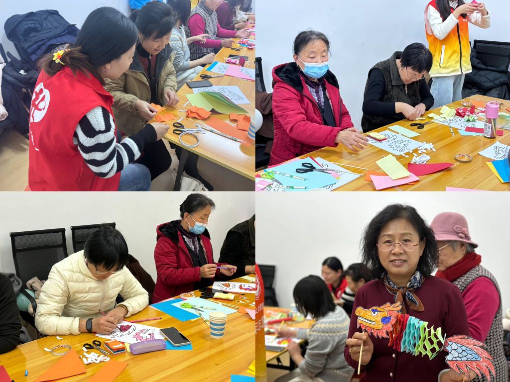 活动伊始,志愿者向组员们详细介绍了非遗“纸翻花”的历史,随后志愿者现场动手演示,让居民对活动充满了期待,同时产生了浓厚的兴趣。接着志愿者们为大家分发彩纸等材料,组员在志愿者的指导下将纸折叠、裁剪,通过巧妙的翻折与组合,逐步制作成精美的翻花,大家更加直观地感受翻花的魅力,并锻炼自己的动手能力和创造力。完成龙身部分之后,大家在志愿者的指导下,将纸翻花中的龙头、龙尾部分涂上自己喜欢的颜色,并小心翼翼地裁剪下来粘到“龙”的身体上。组员们在志愿者老师的带领下,将手中的木棍及折叠好的层叠纸逐一进行粘贴固定,你叠我粘,异常投入。不一会儿,一条条栩栩如生的舞龙作品便呈现在眼前,令人目不暇接。