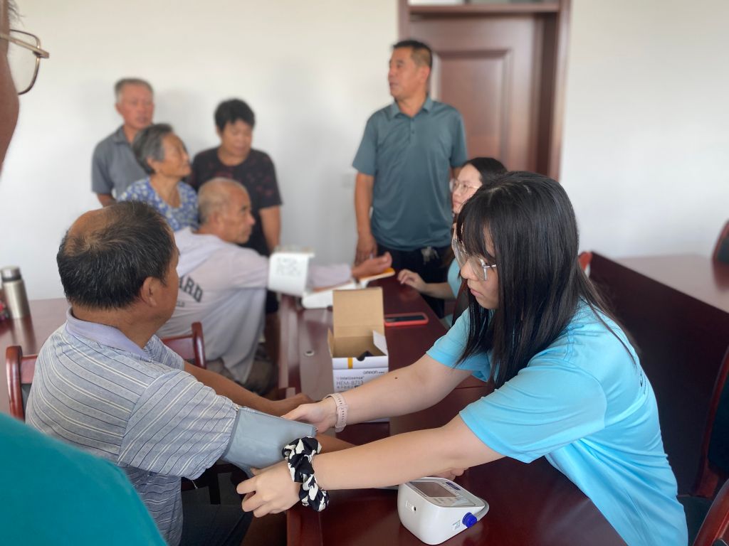 随后,医学生为现场老人开展测血压、耳穴压豆、肩颈推拿等多种形式的服务,让老人在感到温暖的同时感受中国医药文化的博大精深。最近睡眠不好的老人们听闻贴耳穴可以改善失眠,就跃跃欲试。医学生将比米粒还小的黑籽对准穴位贴上,就完成了耳穴压豆。“每天可以按揉一下敷贴的穴位,一般夏天贴2天左右可以自行取下”。医学生一边用拇指轻轻按揉穴位,一边告知相关注意事项。