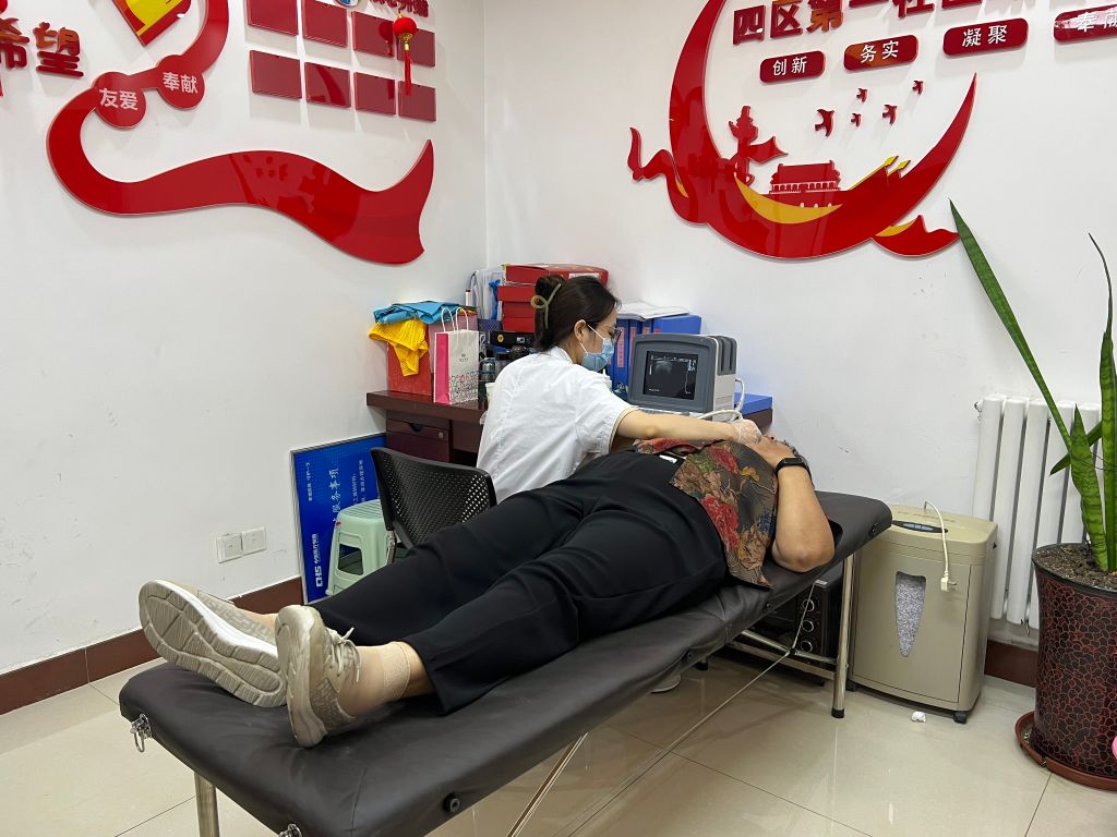 义诊活动在一片热闹的氛围中开展,前来的群众摩肩接踵,络绎不绝。为了更好的服务群众,济南人民医院还带去的完善的医疗设备、B超机、折叠床、纸巾等医疗设备。社区居民们在社工的引导下,有序排队,等待医生为自己体检。医生用熟练而又专业的技术为她们检查甲状腺、乳腺是否有问题存在,针对筛查发现的问题,医生在现场给予居民专业的指导和建议。