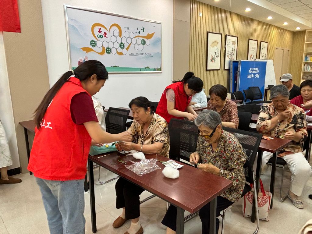 清新的艾草药香阵阵扑鼻,社工将香料、针线包、绸缎、小珠子、彩绳、挂饰配件等琳琅满目的材料一一分给前来参加活动的老人们。在这浓郁的传统文化氛围中,大家开始穿针引线,塞上艾草,缝制彩绳和流苏,兴致盎然地做起了艾草包,老人们之间说说笑笑,互相交流缝制香包经验,不时有老人请求帮助“姑娘,帮我引个针吧”,“这个彩绳是要双股线串过吗”。