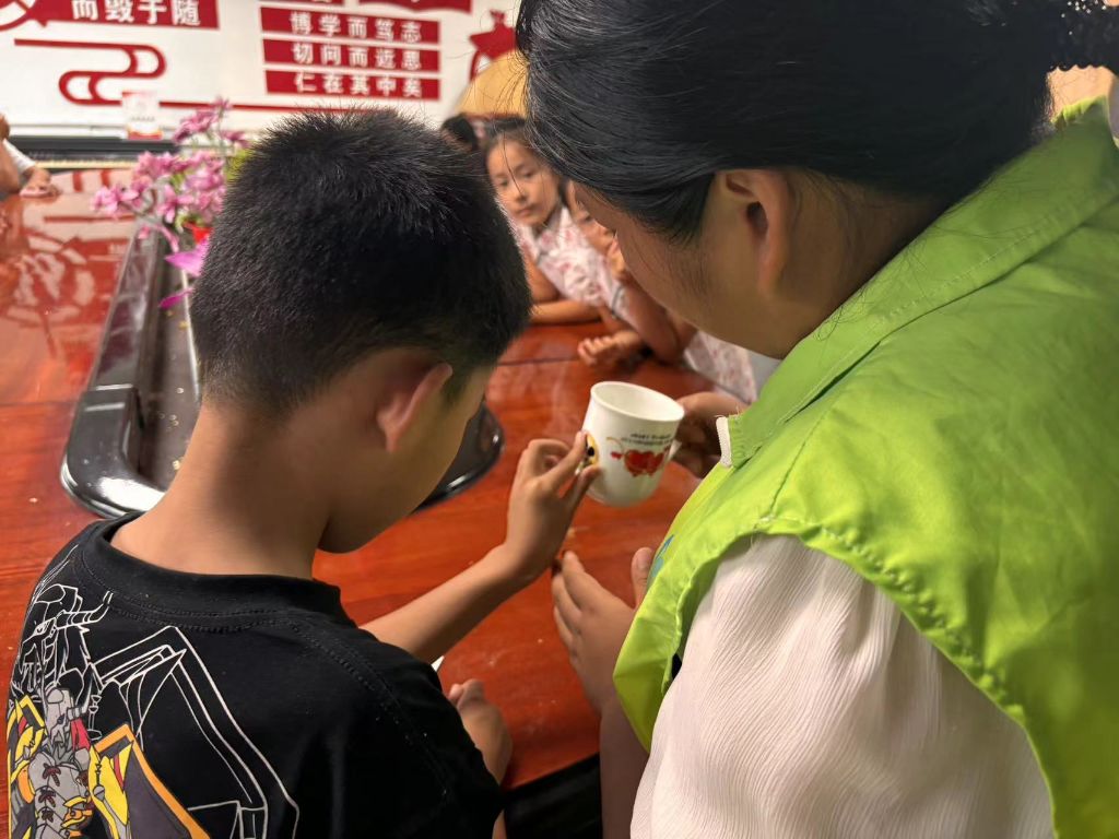 活动中,社工带领孩子们一起观看《皮皮的故事》和《远离烫烫小怪兽》科普动画。通过动画,孩子们知道了“烫烫小怪兽”的危害,并且和社工一起找出了生活中的“烫烫小怪兽”。随后,社工带领孩子们做了“感温贴科学小实验”,社工让儿童将感温纸贴在水杯上,再向水杯中注入热水,孩子们看着贴在热水杯上面的“烫烫小怪兽”的感温贴逐渐变成了红色,都发出惊奇的声音。通过本次小实验,让孩子们利用感温贴纸的变化来判断物品是否处于高温,可以防止烧烫伤的发生。