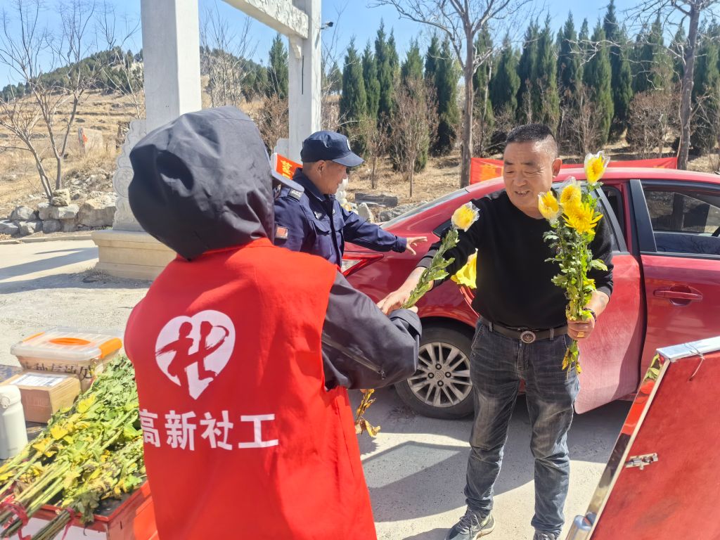社工站与街道工作人员在墓区进出口设立宣传点,督促来访者登记信息,并发放《文明祭祀倡议书》和安全知识手册。他们一遍遍地提醒居民:“春季天气干燥,请您在扫墓时一定不要携带可燃物,避免引发森林火灾”;“物燥风大,扫墓不要烧纸,怀念亲友,可以用鲜花代替纸钱”。通过这些温馨的提示,居民们逐渐树立了文明祭祀、平安祭祀的观念。