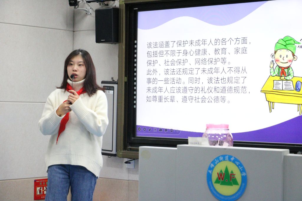 “维护宪法权威,捍卫宪法尊严。”在第十个国家宪法日,为进一步宣传宪法知识、弘扬宪法精神,增强辖区居民的法治观念和宪法意识,提高国家宪法日在社区的知晓率。2023年12月20日,五峰山街道社工站链接山东工艺美术学院志愿者,来到五峰山街道中心小学开展“与法同行 快乐成长——宪法宣讲进校园”活动。