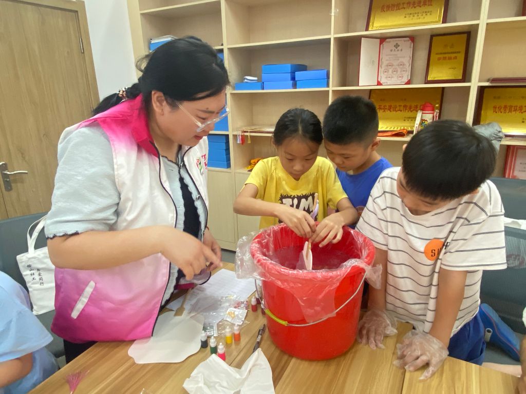 活动伊始,社工以生动有趣的方式介绍了漆扇的历史背景与制作工艺,激发了孩子们浓厚的兴趣。随后,社工逐一示范了漆扇制作的基本步骤,从选色到上漆、绘制图案,每一步都讲解得细致入微。在社工的引导下,孩子们迫不及待地拿起材料,开始尝试自己的漆扇制作之旅。在制作过程中,孩子们充分发挥想象力,有的选择了清新的色彩搭配,绘制出夏日荷塘的美景;有的则大胆运用对比色,创造出独特的视觉冲击力。社工和志愿者们不仅在一旁提供技术指导,还鼓励孩子们相互交流心得,共同解决遇到的问题。通过合作,孩子们学会了倾听、尊重与协作,彼此间的友谊也在不知不觉中加深。活动基于“赋权增能”理论,强调儿童作为活动主体的参与与自我实现,社工作为资源链接者和能力建设者,不仅传授了漆扇制作的基本技巧,更引导孩子们自主设计、选择色彩搭配,激发其内在潜能与创造力。通过这一过程,孩子们不仅掌握了漆艺技能,更在色彩与线条的交织中,学会了自我表达与审美判断。