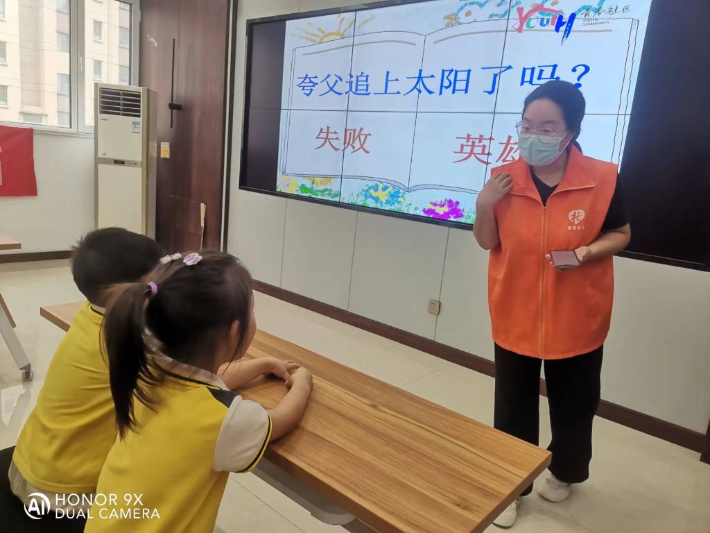 为了让小朋友们了解更多的神话故事,社工利用PPT播放了《夸父逐日》神话故事视频,观看结束后,社工对小朋友们进行提问,小朋友们热情高涨,积极参与,纷纷举手回答问题,场面非常热闹。