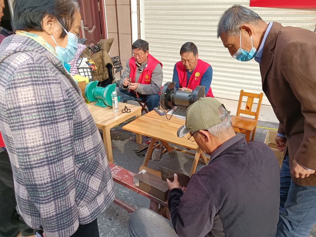 社工为现场居民介绍此次活动的内容并积极带动居民参与到活动中来,在现场维持秩序,与志愿者、社区工作者相互协作做好登记、贴标签、摆放道具等工作。磨刀志愿者们经验丰富,技术娴熟,接过居民的刀具,要先检查刀钝的程度及部位,像中医的望闻问切一样,不同的刀具、不同的毛病,有不同的处理方法。机器开刃后先用粗砂轮粗磨,再浇上水用细砂石细磨,一把刀就变得锋利无比。另一边,理发志愿者认真仔细地修剪着每位居民的头发。
