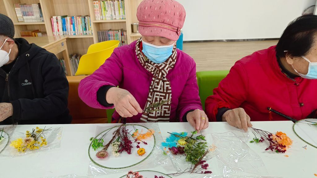 随后,社工及志愿者开始教授大家如何制作团扇。从扇面、干花的选择、粘贴等,每一个步骤都讲解得细致入微。老年居民们聚精会神地听着,不时提出自己的疑问和想法。在社工的耐心指导下,大家纷纷拿起干花,开始在扇面上粘贴出自己喜欢的图案。