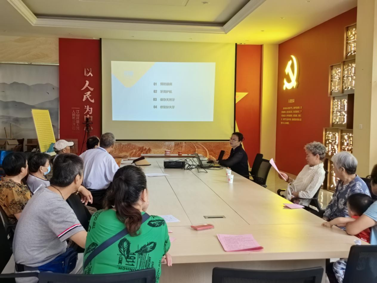 活动现场,社工引导前来参加讲座的老年居民进行签到,并有序就坐。讲座开始,医生用通俗易懂的话语向大家讲述了老年人口腔卫生基础保健、口腔健康预防知识的相关知识。讲解了保持口腔健康的重要性,同时针对牙龈出血、牙齿清洁与洁牙中遇到的常见误区进行纠正与道具模拟展示教学。医护人员还强调要保持口腔清洁,尽量在每次进食后进行刷牙和漱口,维持正确良好的饮食习惯,预防口腔疾病的发生。