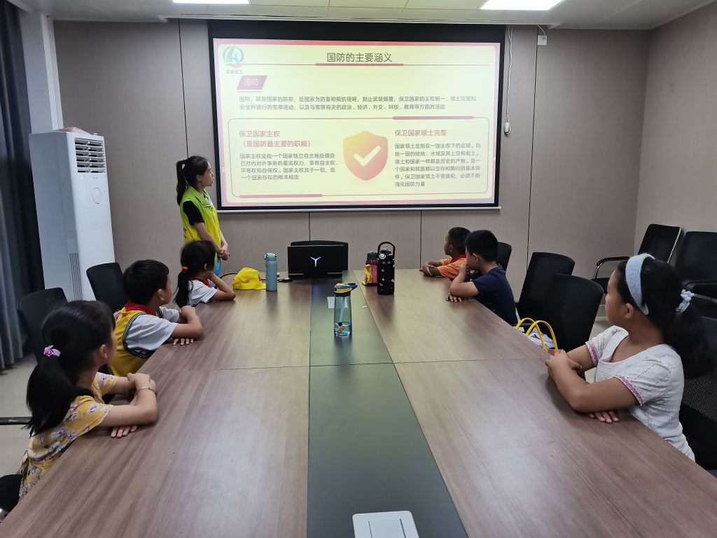 强国必先强军,国防建设是国家实力的象征和国家安全的保障。本次活动社工从国防的主要涵义、国防的基本情况、现代化国防建设、国防的发展历程四个方面详细为青少年讲解国防的重要性,加深青少年对国家安全的理解,了解幸福生活的来之不易。随后,社工与青少年以“现代幸福生活背后的英雄们”为议题进行探讨,引导青少年学习革命英雄身上勇于担当、甘于奉献的大无畏精神,鼓励青少年做有理想、有目标、攒足力量报效祖国的好少年。