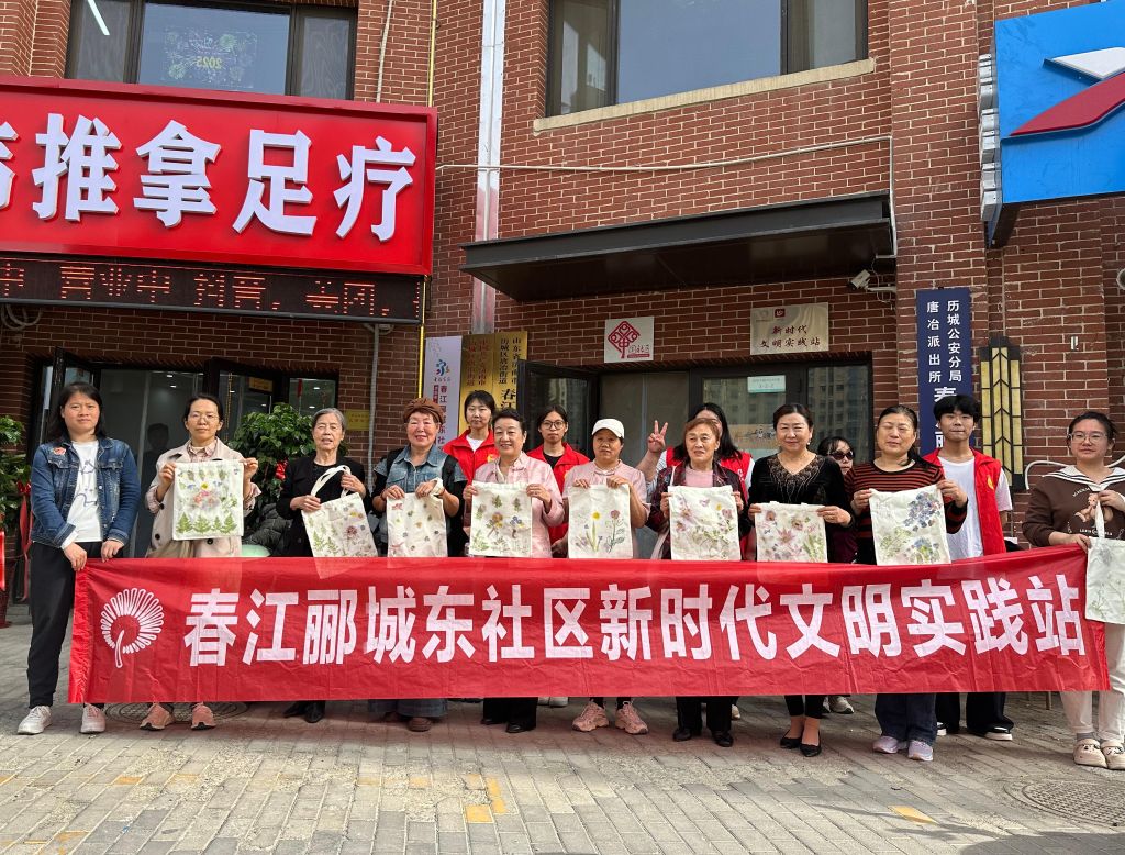 核心环节“布上开花时”中,社工站创新运用“示范-实操-分享”三段式教学:先展示战国时期植物染技艺文物图片,阐释古代人的生态智慧;再由社工和志愿者带领居民分组实践,通过控制敲打力度、汁液渗透度等细节把控作品质量;最后引导参与者分享“留住春天的美”,使环保理念通过情感共鸣自然渗透。