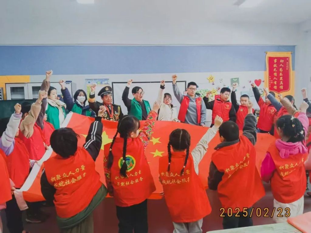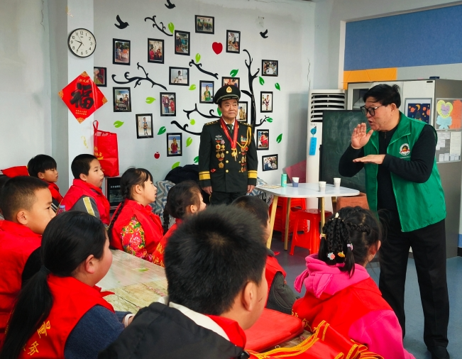 当来到庄严的爱国宣誓环节时,刘爷爷像一棵挺拔的青松,稳稳地站在队伍前方。李爷爷带着孩子们,高高地举起手中鲜艳的国旗,齐声宣誓。“热爱祖国,好好学习,天天向上,为实现中华民族伟大复兴而奋斗!”孩子们的声音清脆而坚定,在活动室内久久回荡。那声音里,有对祖国母亲深深的爱,更有对像刘爷爷这样的解放军前辈们的无限敬仰。他们的眼神坚定而明亮,仿佛在向世界宣告,他们定会接过先辈们手中的接力棒,勇敢前行。