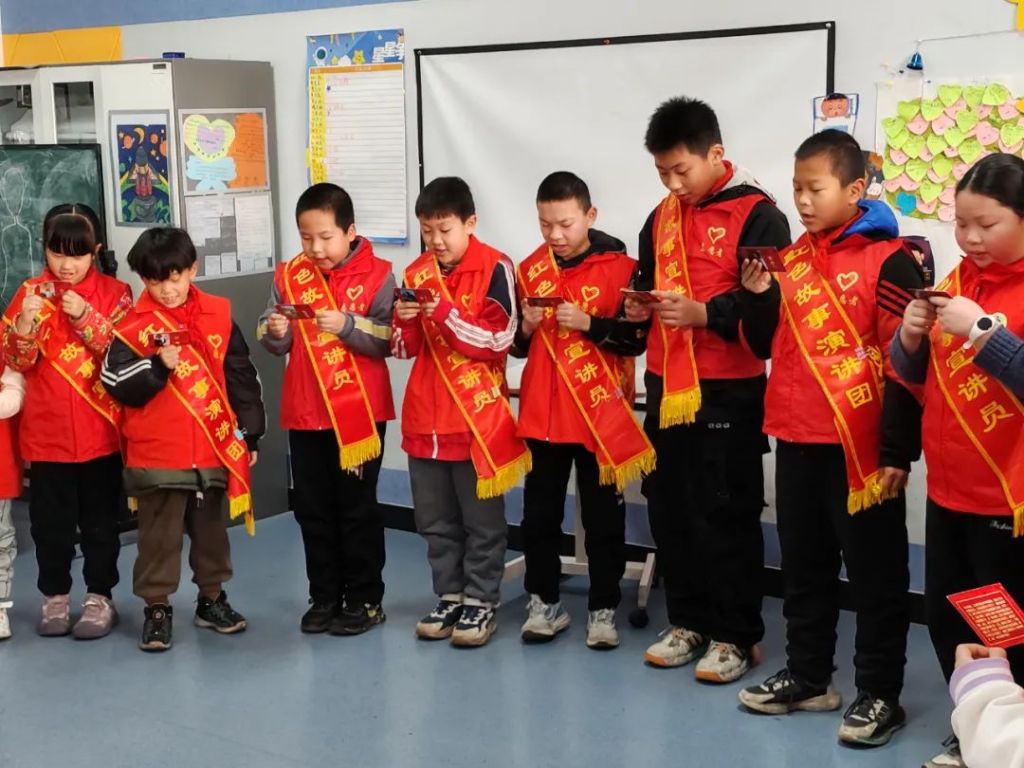 接下来,“红色故事宣讲员”绶带颁发仪式开始了。当孩子们接过绶带的那一刻,他们的笑容比阳光还要灿烂。每个孩子从红色箱子里抽取一个红色故事,他们紧紧地握着手中的红色卡片,此时他们成为了红色宣讲员,大声讲述着红色卡片上的故事,就像握着份沉甸甸一的责任。激励着他们将红色故事传递得更远,让红色精神照亮更多人的心灵。