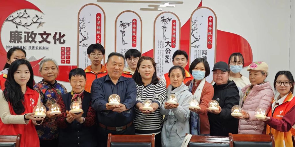 随后,志愿者带领大家制作郁金香云朵灯,大家兴致十足,学得十分认真。“这个环节怎么弄呀?”时不时就有阿姨、叔叔举手寻求帮助,志愿者们微笑着一一讲解、指导。“先解开灯串,穿过底座,再将郁金香小灯一个个串起来,用胶水固定在灯罩上,最后盖上玻璃盖子,打开电源,小夜灯就制作完成了。”过程中小组成员们也在互帮互助,相互展示着自己的成品,现场不断传来欢声笑语,尽情地享受着过程的乐趣。