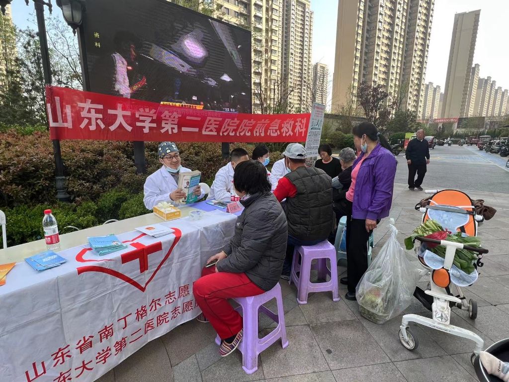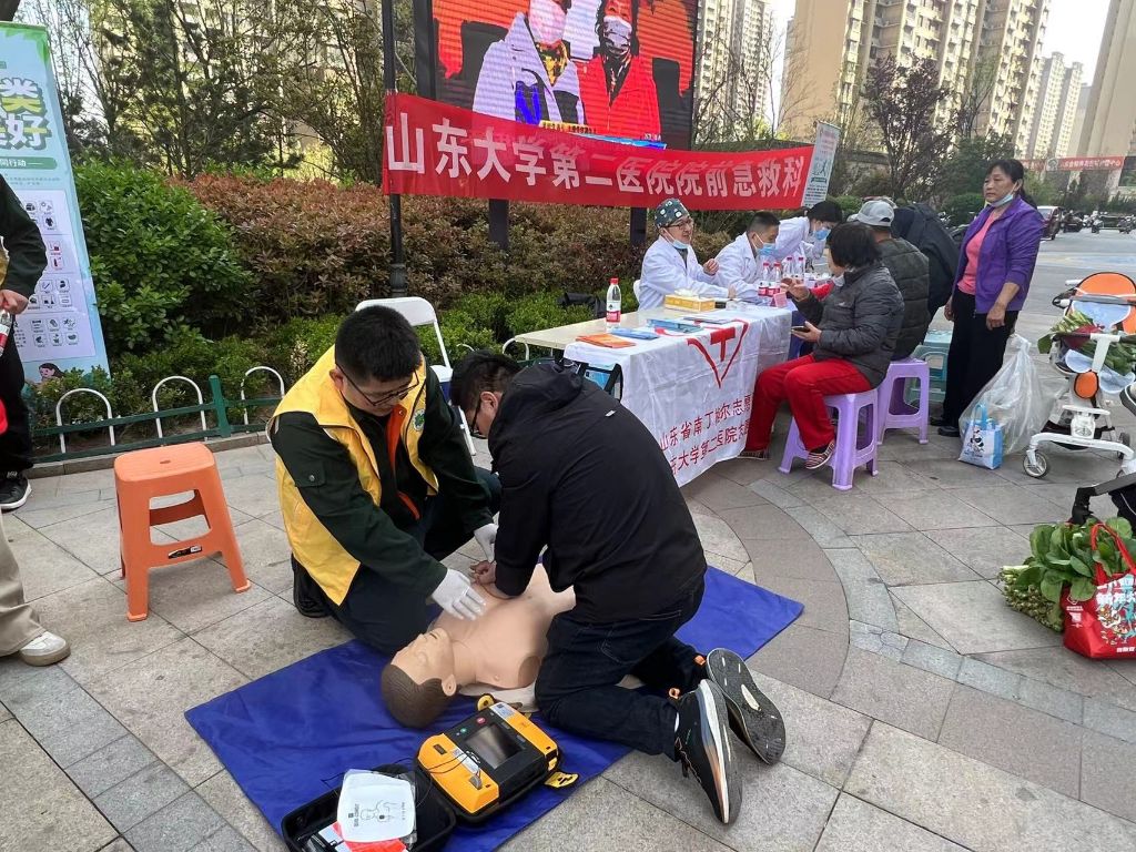 山东大学第二医院志愿者向居民讲解急救知识,并现场演示了正确的心肺复苏、创伤救护基本技能、气道异物梗阻等常见急症的应急处置方法。