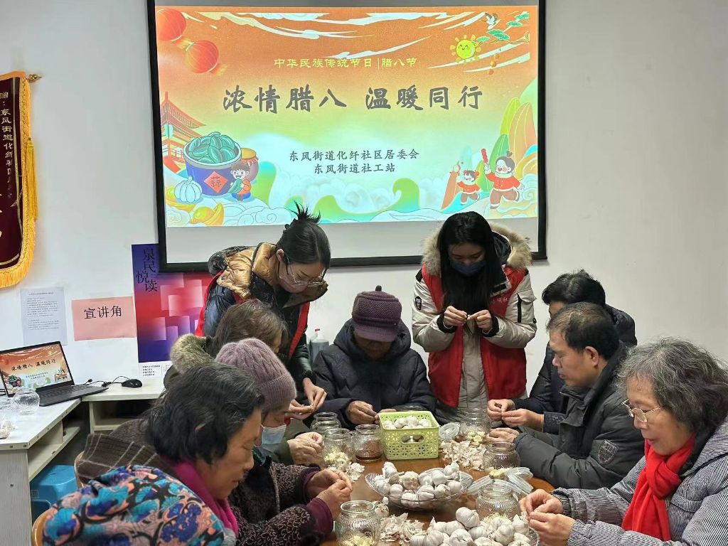 腊八节是中国古老的传统节日,承载着丰厚的文化内涵,为了弘扬优秀的中华传统文化,让辖区老人们感受到浓厚的节日氛围,1月18日,东风街道社工站联合化纤社区开展“腊八你说了蒜”活动。