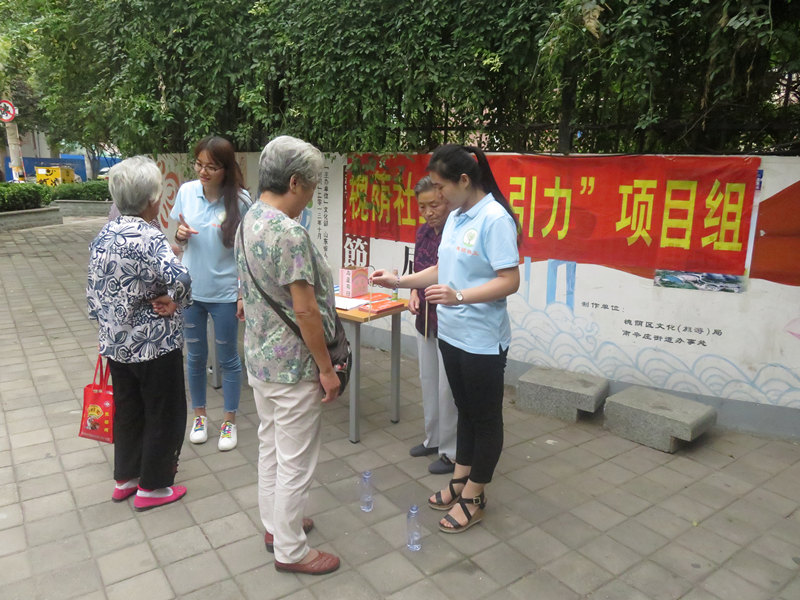 此次外展宣传活动面向全体南辛庄的居民,活动采用社工宣传和重阳节暖身小游戏相结合的宣传方式,活动现场热闹非凡。项目组社工耐心向每位前来咨询的居民解答他们想了解的相关问题,并热情鼓励他们参加暖身小游戏。现场报名环节更为项目组以后的活动奠定了坚实的基础。暖身小游戏的设计为重阳节趣味运动会打下了基础。该环节更是吸引了不少居民参与,特别是“筷子入瓶”游戏。不少居民从驻足观看变成后来的亲身尝试,并纷纷表示他们喜欢和想参与这种既有趣味又有挑战性的小游戏。