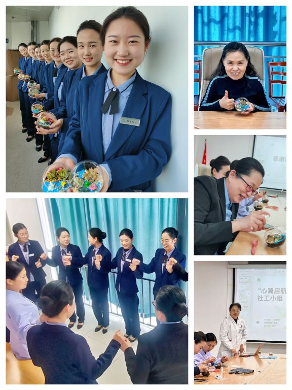 之后,社工讲解了园艺疗愈的概念和方式,并带领大家进行了“微景观园艺创作”。组员以多肉植物为材,搭配小动物等模型,在透明容器中构筑心中的“疗愈型工作场景”。通过具身化的自然接触,将医疗场景与生态智慧联结,使医辅人员在工作之余获得情绪的主导权——正如一株多肉,只需些许阳光与耐心,便能于缝隙中绽放韧性的生机。
