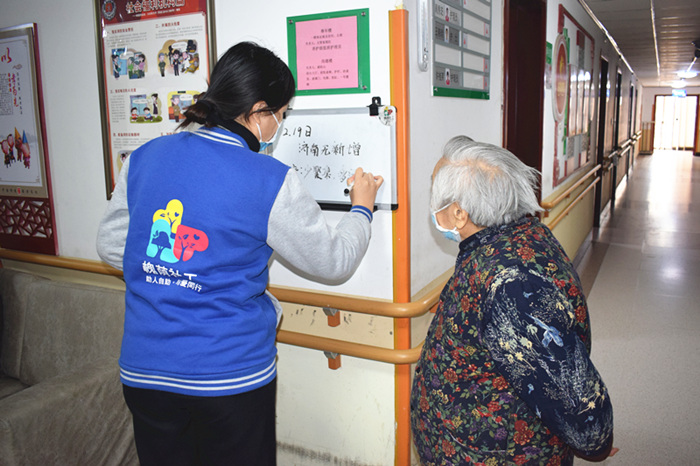 悦银龄养老社工项目组社工在积极协助福利中心开展检测体温、消毒杀菌等疫情防控工作的同时,每天走访住养老人、用白板向住养老人传达疫情信息、通过练习“八段锦”加强住养老人的身体锻炼,以耐心不懈的工作最大化地保障了住养老人的身心健康。