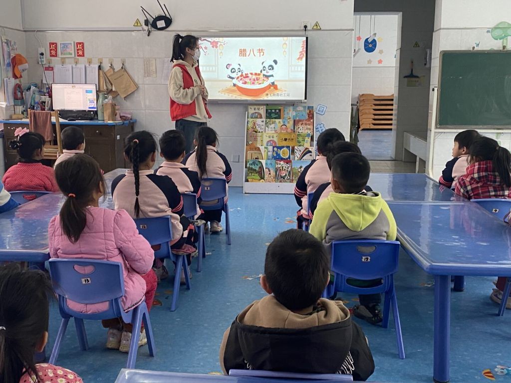 “小孩小孩你别馋,过了腊八就是年……”社工通过播放ppt形式教给小朋友们学习腊八童谣和动作,介绍腊八节的由来,以及各种习俗,使节日的氛围更加浓厚。