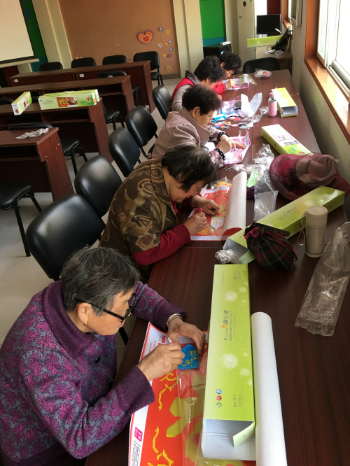 有些老人因为眼睛老花或动手能力弱制作有困难,旁边立马有热心阿姨帮忙点缀。