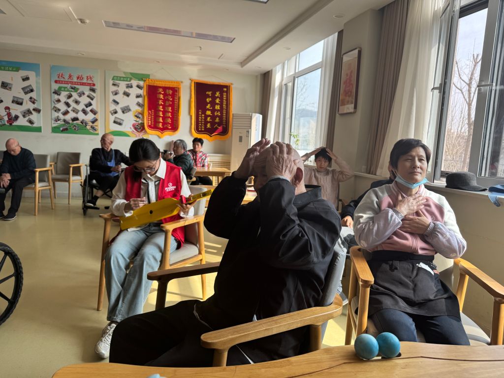 活动伊始,张主任以步恩琴空灵柔和的音色演绎《小燕子》《春天在哪里》等经典曲目。悠扬的琴声在养老服务中心回荡,长者们闭目聆听,手指轻叩节拍,神情逐渐舒展。当《映山红》的旋律响起时,78岁的李爷爷情不自禁跟着哼唱,眼角泛起泪光:“这曲子让我想起和儿时伙伴一起玩耍的日子……”琴声成为打开记忆之门的钥匙,多位老人主动分享往事,现场暖意融融。在社工和志愿者的引导下,长者们随着《我的祖国》《友谊地久天长》等轻快节奏做起手指操。“搓搓掌心、捏捏指尖、张开合拢……”简单的动作搭配朗朗上口的指令,老人们兴致高涨,努力跟随节拍完成每一个动作。
