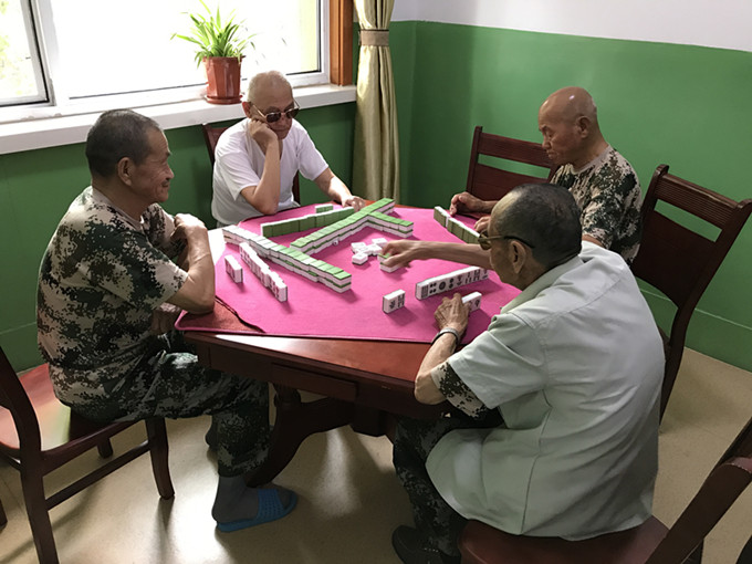 优抚医院休养中心内设备设施齐全,有供优抚对象日常娱乐使用的各项物资器材,但以喜闻乐见的扑克牌、麻将占据上风,每天都可以看到棋牌室门庭如市,里面一片欢声笑语。社工了解到,优抚对象扑克牌多以“升级”打法为主,麻将以“大众麻将”打法为主,因为在家乡,这些都是他们茶余饭后经常性的娱乐活动。在下棋和打麻将的氛围中,或是思维高度集中或是互相调侃一笑,一来二去的优抚对象间成为了无话不谈的老友,大家在意的不是输赢,更多的则是一种快乐祥和的氛围。