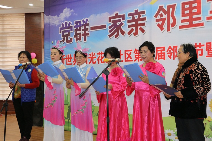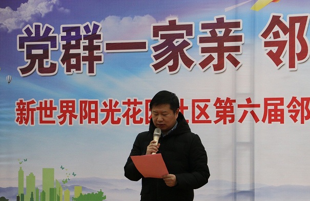 在优美的舞蹈《泉水叮咚》开场后,党群一家亲 邻里享和谐--第六届邻里节暨2018年表彰活动正式开始。社区党委书记居委会主任刘悦华做工作总结,肯定了大家一年来的辛勤付出,道德街街道党工委副书记、办事处主任周晓旭向一直关心、支持、理解、帮助社区工作的优秀志愿者们表示了由衷的感谢并致以新年美好的祝愿和亲切的问候。 新世界阳光花园社区选定“向日葵”为社区之花,街道党工委书记郑华东与社区主任刘悦华共同为“社区之花”进行揭牌,随后,对评选出来的“优秀楼长”和“优秀志愿者”给予表彰,更好的激励志愿者们为建设美好的社区发挥自己的光和热。进一步营造“人人参与,个个争先”的良好氛围,共融共建,共创文明路,企业代表、社区志愿者宣读了《文明街区“益”起来倡议书》,积极传播正能量,同心共筑“阳光社区”。